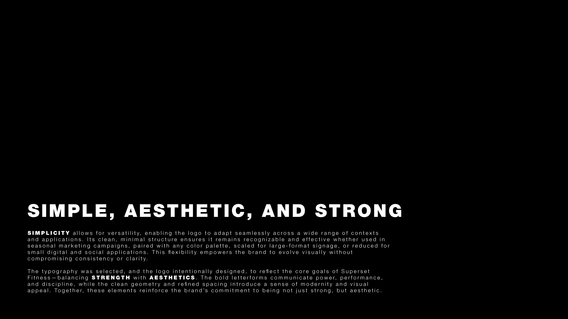 The typography was selected, and the logo intentionally designed, to reflect the core goals of Super Set Fitness: Balancing strength with aesthetics. The bold letterforms communicate power, performance, and discipline, while the clean geometry and refined spacing introduce a sense of modernity and visual appeal. Together, these elements reinforce the brand's commitment to being not just strong, but aesthetic.